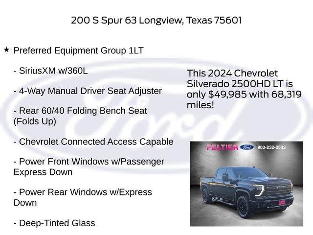 CARFAX One-Owner. Black 2024 Chevrolet Duramax 6.6L V8 Turbodiesel 4D Crew Cab Silverado 2500HD LT 10-Speed Automatic 4WD