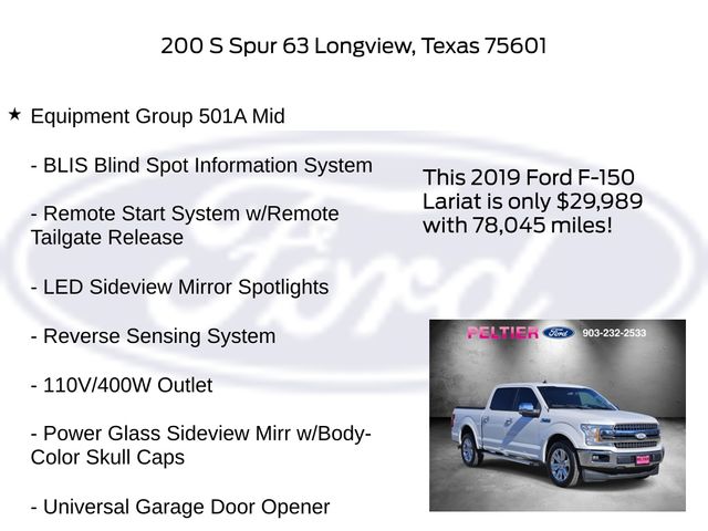 Equipment Group 501A Mid (110V/400W Outlet, BLIS Blind Spot Information System, LED Sideview Mirror Spotlights, Power Glass Sideview Mirr w/Body-Color Skull Caps, Remote Start System w/Remote Tailgate Release, Reverse Sensing System, and Universal Garage Door Opener), Lariat Chrome Appearance Package (Chrome 2-Bar Grille w/4 Minor Bars, Chrome Angular Step Bars, Chrome Door & Tailgate Handles w/Body-Color Bezel, Chrome Skull Caps on Exterior Mirrors, Single-Tip Chrome Exhaust, and Wheels: 18" Chrome-Like PVD), Trailer Tow Package (Class IV Trailer Hitch Receiver, Engine Oil Cooler, Pro Trailer Backup Assist, and Upgraded Front Stabilizer Bar), Ford Blue Advantage: Blue Certified Certified, Navigation System, 18" Machined-Aluminum Wheels, 3.55 Axle Ratio, 4-Wheel Disc Brakes, 7 Speakers, ABS brakes, Adjustable pedals, Air Conditioning, Alloy wheels, AM/FM radio: SiriusXM, AppLink/Apple CarPlay and Android Auto, Auto High-beam Headlights, Auto-dimming door mirrors, Auto-dimming Rear-View mirror, Automatic temperature control, Brake assist, Bumpers: chrome, Compass, Delay-off headlights, Driver door bin, Driver vanity mirror, Dual front impact airbags, Dual front side impact airbags, Electronic Stability Control, Emergency communication system: SYNC 3 911 Assist, Exterior Parking Camera Rear, Front anti-roll bar, Front Center Armrest w/Storage, Front dual zone A/C, Front fog lights, Front reading lights, Front wheel independent suspension, Fully automatic headlights, Heated door mirrors, Heated front seats, Illuminated entry, Leather-Trimmed 40/20/40 Front Seat, Low tire pressure warning, Memory seat, Occupant sensing airbag, Outside temperature display, Overhead airbag, Overhead console, Panic alarm, Passenger door bin, Passenger vanity mirror, Pedal memory, Power door mirrors, Power driver seat, Power passenger seat, Power steering, Power windows, Radio data system, Radio: AM/FM Stereo w/6 Speakers, Rear reading lights, Rear seat center armrest, Rear step bumper, Rear window defroster, Remote keyless entry, Security system, Speed control, Speed-sensing steering, Split folding rear seat, Steering wheel mounted audio controls, SYNC 3, Tachometer, Tailgate Step w/Tailgate Lift Assist, Telescoping steering wheel, Tilt steering wheel, Traction control, Trip computer, Turn signal indicator mirrors, Variably intermittent wipers, Ventilated front seats, Voice-Activated Touchscreen Navigation, Voltmeter,