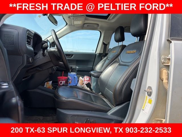 Ford Co-Pilot360 (BLIS Blind Spot Info System w/Cross-Traffic Alert and Lane-Keeping System), Tremor Off-Road Package (Advanced 4WD w/Twin Clutch Rear Drive Unit, Black Chrome Headlamps, Black Chrome Taillamps, Fender Vent w/Tremor Orange Accents, Front All Weather Floor Mats, Front Bumper w/Improved Approach Angle, Front Tow Hooks w/Tremor Orange Painted Accent, Heavy-Duty Transmission Cooler, Off-Road Screen in Cluster, Off-Road Tuned Suspension, Trail Control, Trailer Hitch Receiver w/4-Pin Connector, Tremor Box Decals & Badges, Tremor Instrument Panel & Floor Console Accents, Unique Front & Rear Ford Logos, Unique Style Upper Grille w/Tremor Orange Accents, and Wheels: 17" Machined-Face Tarnished Dark Aluminum), Ford Blue Advantage: Blue Certified Certified, Navigation System, 3.63 Axle Ratio, 4-Wheel Disc Brakes, 4G LTE Wi-Fi Hotspot Removal, 6 Speakers, ABS brakes, Air Conditioning, Alloy wheels, AM/FM radio, Apple CarPlay/Android Auto, Auto High-beam Headlights, Automatic temperature control, Brake assist, Bumpers: body-color, Compass, Delay-off headlights, Driver door bin, Driver vanity mirror, Dual front impact airbags, Dual front side impact airbags, Electronic Stability Control, Exterior Parking Camera Rear, Four wheel independent suspension, Front & Rear Floor Liners w/Front Carpet Floor Mats, Front anti-roll bar, Front Bucket Seats, Front Center Armrest, Front reading lights, Fully automatic headlights, Illuminated entry, Knee airbag, Low tire pressure warning, Occupant sensing airbag, Outside temperature display, Overhead airbag, Overhead console, Panic alarm, Passenger door bin, Passenger vanity mirror, Power door mirrors, Power Moonroof, Power steering, Power windows, Radio data system, Radio: AM/FM Stereo w/6 Speakers, Rear anti-roll bar, Rear seat center armrest, Rear step bumper, Remote keyless entry, Remote Start System, Security system, Speed control, Speed-sensing steering, Steering wheel mounted audio controls, Tachometer, Telescoping steering wheel, Tilt steering wheel, Traction control, and Trip computer.