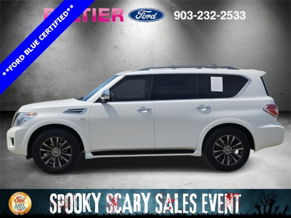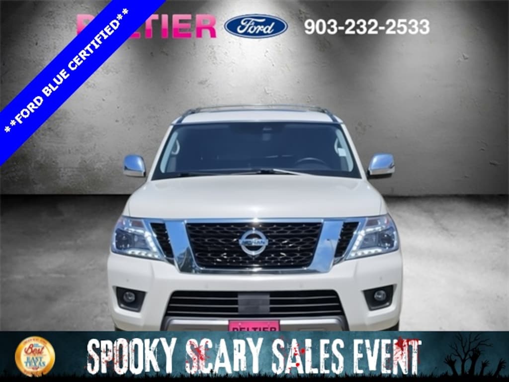 Captain's Chairs Package (2nd Row Captain's Chairs and 2nd Row Center Console w/ Padded Armrest), Carpeted Floor Mats w/ Captain Seat Package, Ford Blue Advantage: Blue Certified Certified, Navigation System, 13 Speakers, 2.937 Axle Ratio, 3rd row seats: split-bench, 4-Wheel Disc Brakes, A/V remote, ABS brakes, Air Conditioning, Alloy wheels, AM/FM radio: SiriusXM, Anti-whiplash front head restraints, Auto tilt-away steering wheel, Auto-dimming door mirrors, Auto-dimming Rear-View mirror, Auto-leveling suspension, Automatic temperature control, Brake assist, Bumpers: body-color, CD player, Cross Bars, Delay-off headlights, Driver door bin, Driver vanity mirror, Dual front impact airbags, Dual front side impact airbags, Electronic Stability Control, Emergency communication system: NissanConnect Services, Four wheel independent suspension, Front anti-roll bar, Front Bucket Seats, Front Center Armrest, Front dual zone A/C, Front fog lights, Front reading lights, Fully automatic headlights, Garage door transmitter: HomeLink, Headphones, Heated & Cooled Front Bucket Seats w/Driver Memory, Heated door mirrors, Heated front seats, Heated rear seats, Heated steering wheel, Illuminated entry, Illuminated Kick Plates, Leather Shift Knob, Leather-Appointed Seat Trim, Low tire pressure warning, Memory seat, Occupant sensing airbag, Outside temperature display, Overhead airbag, Overhead console, Panic alarm, Passenger door bin, Passenger vanity mirror, Power door mirrors, Power driver seat, Power Liftgate, Power moonroof, Power passenger seat, Power steering, Power windows, Radio data system, Radio: AM/FM/SXM/CD/MP3/HD, Rain sensing wipers, Rear air conditioning, Rear anti-roll bar, Rear reading lights, Rear seat center armrest, Rear window defroster, Rear window wiper, Reclining 3rd row seat, Remote keyless entry, Roof rack: rails only, Security system, Special Paint - Pearl White, Speed control, Speed-sensing steering, Speed-Sensitive Wipers, Split folding rear seat, Spoiler, Steering wheel memory, Steering wheel mounted audio controls, Tachometer, Telescoping steering wheel, Tilt steering wheel, Traction control, Trip computer, Turn signal indicator mirrors, Variably intermittent wipers, Ventilated front seats, Voltmeter, and Wheels: 20" Machine-Faced Chrome w/Tinted CC.