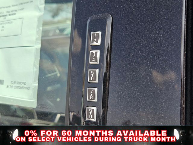 Equipment Group 601A High (Electronic Locking with 3.55 Axle Ratio and Wheels: 20" Chrome-Like PVD), Ford Connectivity Package (1-Year Included), FX4 Off-Road Package (4x4 FX4 Off-Road Bodyside Decal, Hill Descent Control, and Off-Road Tuned Front Shock Absorbers), Internet access capable: 5G Modem - Ford Connectivity Package, 4WD, 4-Wheel Disc Brakes, 8 Speakers, ABS brakes, Adjustable pedals, Air Conditioning, Alloy wheels, AM/FM radio: SiriusXM with 360L, Auto High-beam Headlights, Auto tilt-away steering wheel, Auto-dimming door mirrors, Auto-dimming Rear-View mirror, Automatic temperature control, Brake assist, Chrome wheels, Compass, Delay-off headlights, Driver door bin, Driver vanity mirror, Driver's Side SecuriCode Keyless-Entry Keypad, Dual front impact airbags, Dual front side impact airbags, Electronic Stability Control, Emergency communication system: SYNC 4 911 Assist, Front anti-roll bar, Front Bucket Seats, Front Center Armrest, Front dual zone A/C, Front fog lights, Front reading lights, Front wheel independent suspension, Fully automatic headlights, Garage door transmitter, Genuine wood dashboard insert, Head-Up Display, Heated door mirrors, Heated front seats, Heated rear seats, Heated steering wheel, Illuminated entry, Leather steering wheel, Low tire pressure warning, Memory seat, Navigation system: Connected Navigation, Occupant sensing airbag, Outside temperature display, Overhead airbag, Overhead console, Panic alarm, Passenger door bin, Passenger vanity mirror, Pedal memory, Power door mirrors, Power driver seat, Power passenger seat, Power steering, Power windows, Pro Power Onboard - 2KW, Radio data system, Radio: B&O Sound System by Bang and Olufsen, Rain sensing wipers, Rear reading lights, Rear seat center armrest, Rear step bumper, Rear window defroster, Remote keyless entry, Security system, Speed control, Split folding rear seat, Steering wheel memory, Steering wheel mounted audio controls, SYNC 4 with Enhanced Voice Recognition, Tachometer, Telescoping steering wheel, Tilt steering wheel, Traction control, Trip computer, Turn signal indicator mirrors, Twin Panel Moonroof, Variably intermittent wipers, and Ventilated front seats.