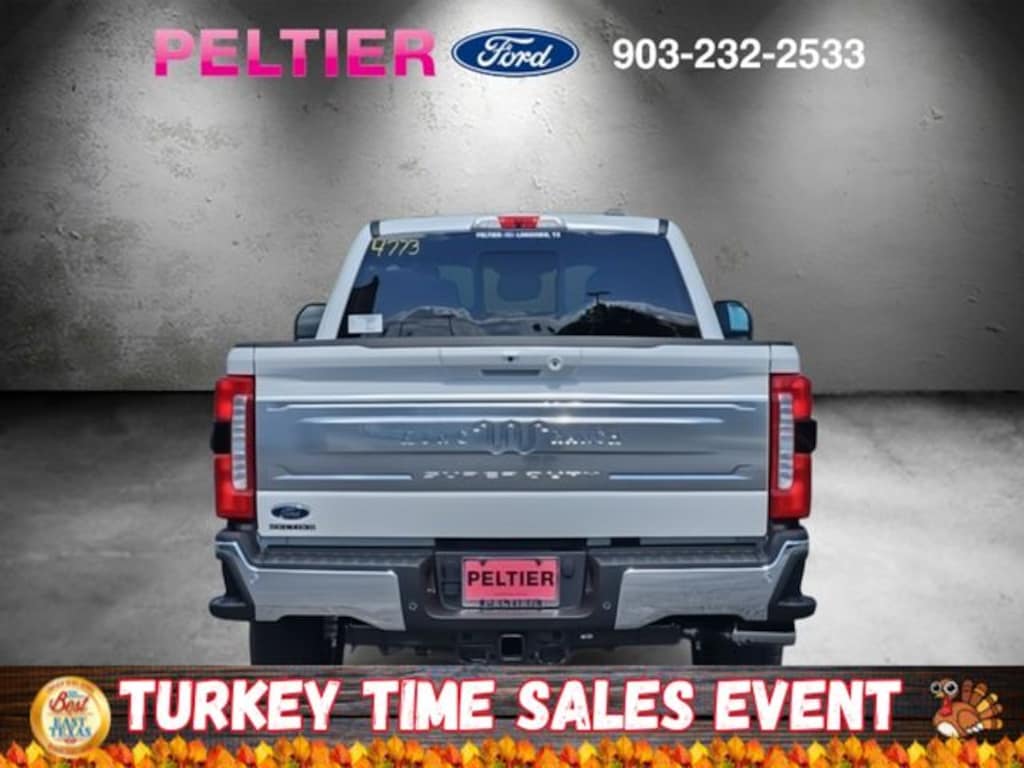 Chrome Package (Chrome Door Handles, Chrome Exhaust Tip, Chrome Front & Rear Bumpers, Unique Chrome Mirror Caps, and Wheels: 20" Chrome PVD Aluminum), F-250 >10K GVWR Package, Ford Connectivity Package (1-Year Included), FX4 Off-Road Package (Hill Descent Control, Off-Road Specifically Tuned Shock Absorbers, and Unique FX4 Off-Road Box Decal), High Capacity 11.6" Axle Upgrade Package, Internet access capable: 5G Modem - Ford Connectivity Package, Order Code 700A, 4WD, 14 Speakers, 4-Wheel Disc Brakes, 410 Amp Dual Alternators, ABS brakes, Adjustable pedals, Air Conditioning, Alloy wheels, AM/FM radio: SiriusXM with 360L, Auto High-beam Headlights, Auto tilt-away steering wheel, Auto-dimming Rear-View mirror, Automatic temperature control, Brake assist, Compass, Delay-off headlights, Driver door bin, Driver vanity mirror, Dual front impact airbags, Dual front side impact airbags, Electronic Stability Control, Emergency communication system: SYNC 4 911 Assist, Engine Block Heater, Flow-Through Console, Front anti-roll bar, Front Bucket Seats, Front Center Armrest, Front dual zone A/C, Front fog lights, Front License Plate Bracket, Front reading lights, Fully automatic headlights, Garage door transmitter, Heads-Up Display, Heated door mirrors, Heated front seats, Heated rear seats, Heated steering wheel, Illuminated entry, Leather steering wheel, Low tire pressure warning, Memory seat, Navigation system: Connected Navigation, Outside temperature display, Overhead airbag, Overhead console, Panic alarm, Passenger door bin, Passenger vanity mirror, Pedal memory, Power door mirrors, Power driver seat, Power passenger seat, Power steering, Power windows, Pro Power Onboard - 2kW, Radio: B&O Unleashed Sound System by Bang & Olufsen, Rain sensing wipers, Rear reading lights, Rear seat center armrest, Rear step bumper, Rear window defroster, Remote keyless entry, SecuriCode Keyless Entry Keypad (Driver's Side), Security system, SiriusXM w/360L, Speed control, Split folding rear seat, Steering wheel memory, Steering wheel mounted A/C controls, Steering wheel mounted audio controls, SYNC 4 w/Enhanced Voice Recognition, Tachometer, Telescoping steering wheel, Tilt steering wheel, Traction control, Trip computer, Turn signal indicator mirrors, Twin Panel Power Moonroof, Unique King Ranch Leather 40/Console/40 Seats, Upfitter Switches (6), Variably intermittent wipers, Ventilated front seats, and Wheels: 20" Bright Machined Aluminum.