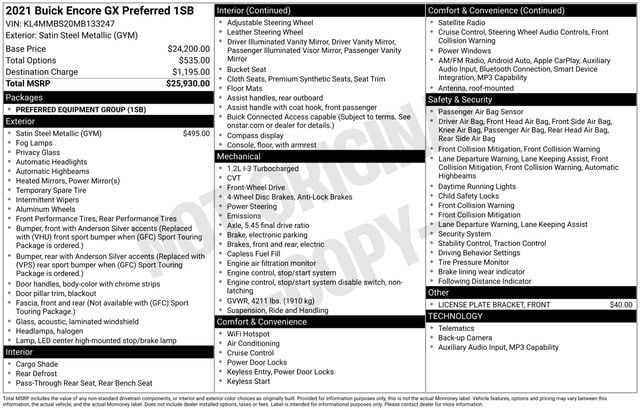 Clean CARFAX. Satin Steel Metallic 2021 Buick ECOTEC 1.2L Turbo 4D Sport Utility Encore GX Preferred CVT FWD