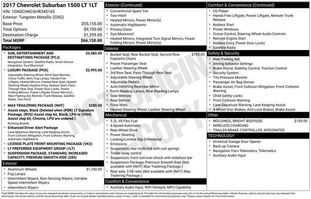 Enhanced Driver Alert Package (Forward Collision Alert Sensor Indicator, Intellibeam Headlamps w/Automatic High Beam On/Off, Lane Keep Assist, Low Speed Forward Automatic Braking, and Safety Alert Driver Seat), License Plate Front Mounting Package, Luxury Package (2nd Row Pwr Release 60/40 Split Folding Bench Seat, 3rd Row 60/40 Power Fold Split-Bench, Fog Lamps, Front & Rear Parking Assist, Hands Free Power Liftgate, Heated 2nd Row Outboard Seats, Heated Leather Wrapped Steering Wheel, Memory Settings, Passive Entry System, Power Folding & Adjustable Heated Outside Mirrors, Power Tilt & Telescoping Steering Column, Push Button Keyless Start, Rear Cross-Traffic Alert Sensor Indicator, Side Blind Zone Alert w/Lane Change Alert, and Wireless Charging), Max Trailering Package (3.42 Rear Axle Ratio and Integrated Trailer Brake Controller), Preferred Equipment Group 1LT (1st & 2nd Row Color-Keyed Carpeted Floor Mats, 2nd Row 60/40 Split-Folding Manual Bench, 3rd Row Manual 60/40 Split-Folding Fold Flat Bench, 4-Wheel Antilock Disc Brakes, Auto-Dimming Inside Rear-View Mirror, Black Assist Steps, Bose Premium Audio System Feature, Color-Keyed Carpeting Floor Covering, Driver Inboard & Front Passenger Airbags, Electronic Cruise Control w/Set & Resume Speed, Enhanced Driver Information Center, Extended-Range Remote Keyless Entry, Floor Console w/Storage Area, Leather-Wrapped Steering Wheel, OnStar Basic Plan For 5 Years, Power Liftgate, Power-Adjustable Accelerator & Brake Pedals, Rear Park Assist w/Audible Warning, Remote Vehicle Start, Roof-Mounted Luggage Rack Side Rails, SiriusXM Satellite Radio, and Universal Home Remote), Premium Smooth Ride Sus