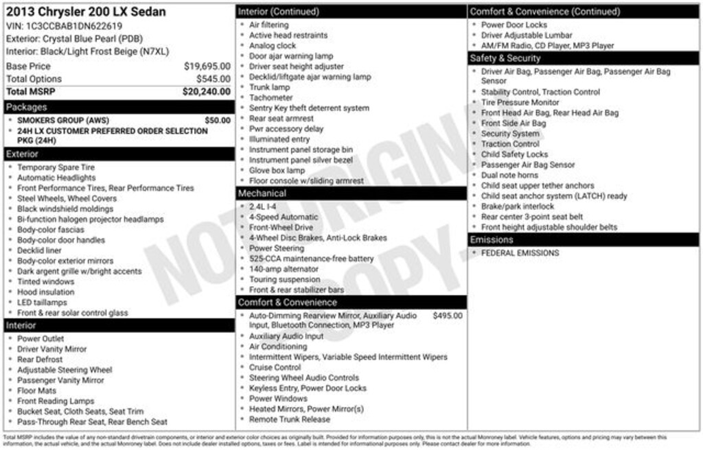 2013 Chrysler 200 LX 2.4L I4 DOHC 16V Dual VVT FWD 4-Speed Automatic VLP Crystal Blue Pearlcoat