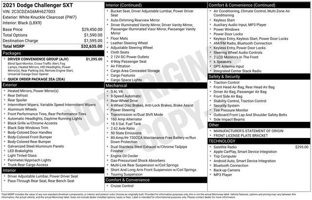 2021 Dodge Challenger SXT 3.6L V6 24V VVT RWD 8-Speed Automatic White Knuckle Clearcoat
