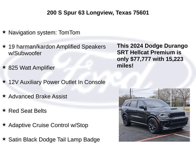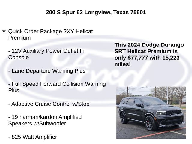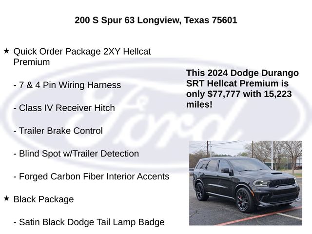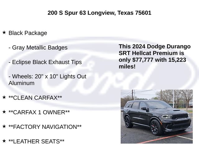 Clean CARFAX. DB Black Crystal Clearcoat 2024 Dodge 6.2L Supercharged HEMI V8 SRT 4D Sport Utility Durango SRT Hellcat 8-Speed Automatic AWD