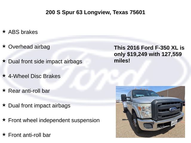 This 2016 Ford F-350SD XL DRW is a workhorse ready to tackle any job. Powered by a robust 6.2L V8 EFI SOHC 16V Flex Fuel engine paired with a TorqShift 6-Speed Automatic transmission, this truck delivers the performance and capability you need. The sleek Silver exterior complements the rugged design, making this F-350 both tough and stylish.