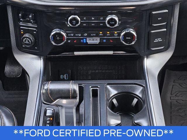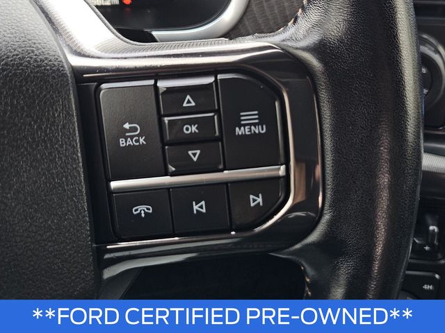 Equipment Group 700A Standard, FX4 Off-Road Package (4x4 FX4 Off-Road Bodyside Decal, Electronic Locking w/3.31 Axle Ratio, Hill Descent Control, Monotube Rear Shocks, Off-Road Tuned Front Shock Absorbers, Rock Crawl Mode, and Tray Style Floor Liner), Max Trailer Tow Package (Class IV Trailer Hitch Receiver, Extended Range 36 Gallon Fuel Tank, Integrated Trailer Brake Controller, and Pro Trailer Backup Assist), Ford Blue Advantage: Blue Certified Certified, 4WD, Front Bucket Seats, Front Center Armrest, Heated front seats, Heated rear seats, Navigation System, Navigation system: Connected Navigation, Power passenger seat, Split folding rear seat, Ventilated front seats, 20" Polished Aluminum Wheels, 3.31 Axle Ratio, 360 Degree Camera, 4-Wheel Disc Brakes, 8 Speakers, ABS brakes, Adjustable pedals, Air Conditioning, Alloy wheels, AM/FM radio: SiriusXM with 360L, Auto High-beam Headlights, Auto Start-Stop Removal, Auto tilt-away steering wheel, Auto-dimming door mirrors, Auto-dimming Rear-View mirror, Automatic temperature control, Brake assist, Bumpers: body-color, Compass, Delay-off headlights, Driver door bin, Driver vanity mirror, Dual front impact airbags, Dual front side impact airbags, Electronic Locking w/3.55 Axle Ratio, Electronic Stability Control, Emergency communication system: SYNC 4 911 Assist, Exterior Parking Camera Rear, Front anti-roll bar, Front dual zone A/C, Front fog lights, Front License Plate Bracket, Front reading lights, Front wheel independent suspension, Fully automatic headlights, Garage door transmitter, Heated door mirrors, Heated steering wheel, Illuminated entry, Interior Work Surface, LED Sideview Mirror Spotlights, Low tire pressure warning, Memory seat, Occupant sensing airbag, Outside temperature display, Overhead airbag, Overhead console, Panic alarm, Passenger door bin, Passenger vanity mirror, Pedal memory, Power door mirrors, Power driver seat, Power steering, Power Telescoping/Glass/Folding Trailer Tow Mirrors, Power windows, Radio data system, Radio: B&O Sound System by Bang & Olufsen, Rain sensing wipers, Rear reading lights, Rear seat center armrest, Rear step bumper, Rear window defroster, Remote keyless entry, Security system, Speed control, Speed-sensing steering, Steering wheel memory, Steering wheel mounted audio controls, SYNC 4 w/Enhanced Voice Recognition, Tachometer, Telescoping steering wheel, Tilt steering wheel, Traction control, Trip computer, Turn signal indicator mirrors, Unique Multi-Contour Leather Bucket Seats, Variably intermittent wipers, and Voltmeter.