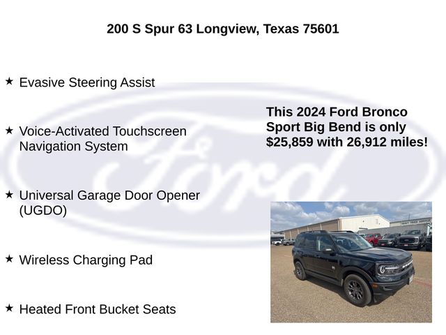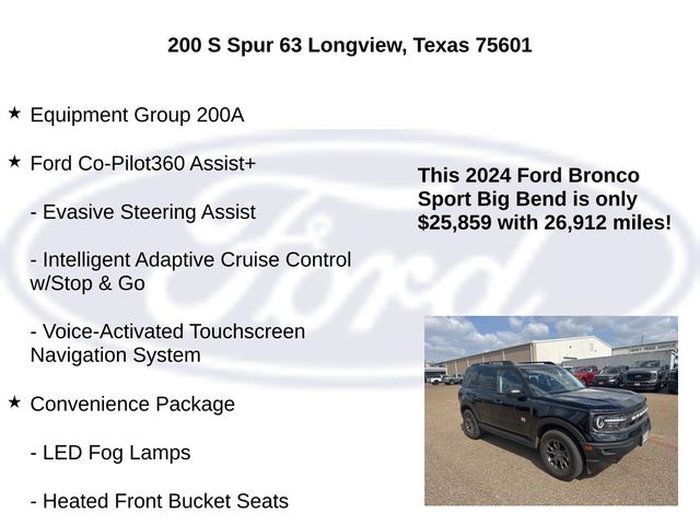 Clean CARFAX. CARFAX One-Owner. Shadow Black 2024 Ford 1.5L EcoBoost 4D Sport Utility Bronco Sport Big Bend 8-Speed Automatic 4WD