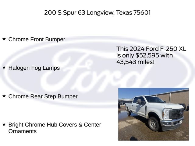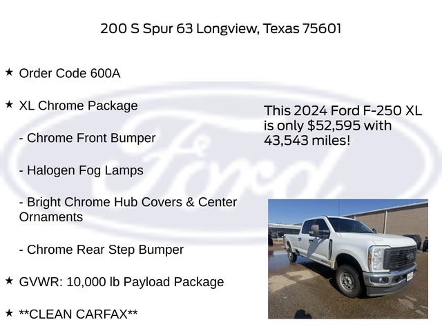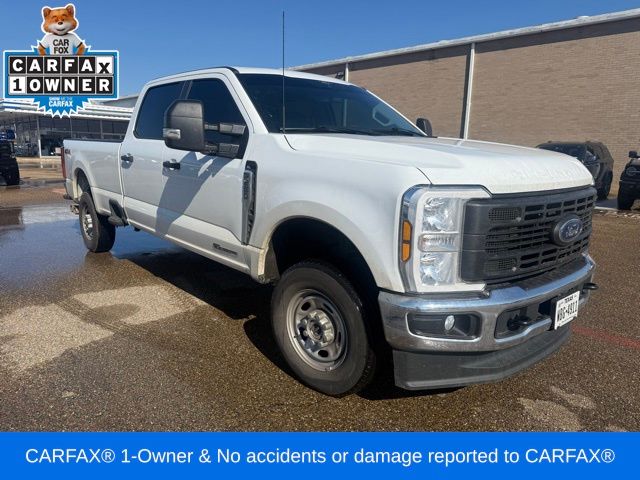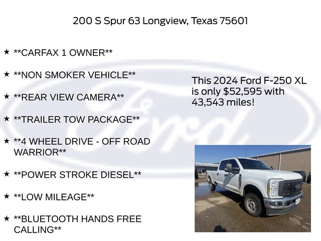 Clean CARFAX. CARFAX One-Owner. Oxford White 2024 Ford Power Stroke 6.7L V8 DI 32V OHV Turbodiesel 4D Crew Cab F-250SD XL 10-Speed Automatic 4WD