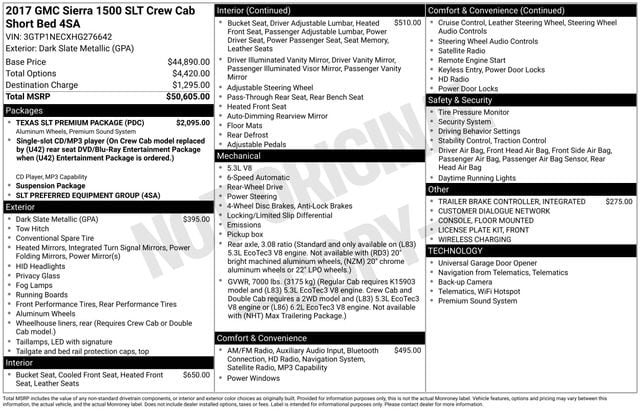 Preferred Equipment Group 4SA (110-Volt AC Power Outlet, 150 Amp Alternator, 1st & 2nd Row Color-Keyed Carpeted Floor Mats, 4.2" Diagonal Color Display Driver Info Center, Auto-Dimming Inside Rear-View Mirror, Auxiliary External Transmission Oil Cooler, Chrome Bodyside Moldings, Chrome Door Handles, Chrome Mirror Caps, Color-Keyed Carpeting, Deep-Tinted Glass, Driver & Front Passenger Illuminated Vanity Mirrors, Dual-Zone Automatic Climate Control, Electric Rear-Window Defogger, EZ Lift & Lower Tailgate, Heavy-Duty Rear Locking Differential, Leather Wrapped Steering Wheel w/Cruise Controls, LED Cargo Box Lighting, LED Tailamps w/Signature, Manual Tilt/Telescoping Steering Column, OnStar 3 Month Guidance Plan, OnStar w/4G LTE, Power Adjustable Pedals, Power Folding & Adjustable Heated Outside Mirrors, Power Windows w/Driver Express Up & Down, Rear 60/40 Folding Bench Seat (Folds Up), Rear Vision Camera, Rear Wheelhouse Liners, Remote Keyless Entry, Remote Vehicle Starter System, Single Slot CD/MP3 Player, Steering Wheel Audio Controls, Theft Deterrent System (Unauthorized Entry), Thin Profile LED Fog Lamps, Universal Home Remote, and Remote Locking Tailgate), Texas SLT Premium Package (20" x 9" Polished Aluminum Wheels, 6" Rectangular Chromed Tubular Assist Steps, and Texas Emblem), Trailering Equipment, 6-Speed Automatic Electronic with Overdrive, Jet Black Leather, 10-Way Power Driver's Seat Adjuster, 3.08 Rear Axle Ratio, 3.42 Rear Axle Ratio, 4-Wheel Disc Brakes, 40/20/40 Front Split Bench Seat, 6 Speakers, 6-Speaker Audio System, ABS brakes, Adjustable pedals, Air Conditioning, Alloy wheels, AM/FM radio, Auto-dimming door mirrors, Auto-dimming Rear-View mirror, Automatic temperature control, Bodyside moldings, Brake assist, Bumpers: chrome, CD player, Compass, Delay-off headlights, Driver door bin, Driver vanity mirror, Dual front impact airbags, Dual front side impact airbags, Electronic Stability Control, Emergency communication system: OnStar Guidance, Exterior Parking Camera Rear, Floor Mounted Console, Front anti-roll bar, Front Center Armrest w/Storage, Front dual zone A/C, Front fog lights, Front Full Feature Power Reclining Bucket Seats, Front License Plate Kit, Front reading lights, Front wheel independent suspension, Fully automatic headlights, Garag