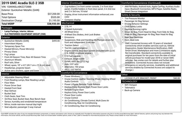 Odometer is 4639 miles below market average! 2019 GMC Acadia SLE-2 2.5L 4-Cylinder DGI DOHC VVT AWD 6-Speed Automatic Quicksilver Metallic