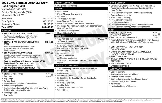 Preferred Equipment Group 4SA (120-Volt Bed Mounted Power Outlet, 120-Volt Instrument Panel Power Outlet, 2 Charge-Only Rear USB Ports, 2 Charge/Data USB Ports, 2-Speed Active Transfer Case, 6-Speaker Audio System Feature, Chrome Surround Grille w/Chrome Insert Bars, Deep-Tinted Glass, Electric Rear-Window Defogger, Front Rain-Sensing Wipers, Heated Driver & Front Outboard Passenger Seats, Keyless Open & Start, LED Cargo Area Lighting, Manual Tilt-Wheel/Telescoping Steering Column, Power Front Windows w/Passenger Express Up/Down, Push Button Start, Remote Vehicle Starter System, SiriusXM w/360L Trial Subscription, Steering Wheel Audio Controls, Unauthorized Entry Theft-Deterrent System, and Wireless Phone Projection), Sierra HD Pro Safety Plus Package (Bed View Camera w/2 Trailer Camera Provisions, HD Surround Vision, Rear Cross Traffic Alert, Safety Alert Seat, Trailer Camera Provisions, Trailer Side Blind Zone Alert, and Ultrasonic Front & Rear Park Assist), SLT Convenience Package (2 Charge/Data USB Ports Inside Center Console, Bose Premium 7-Speaker Sound System, Floor-Mounted Center Console, Front Bucket Seats, Ventilated Driver & Front Passenger Seats, and Wireless Charging), SLT Preferred Package (Adaptive Cruise Control, Heated 2nd Row Outboard Seats, Power Sliding Rear Window w/Defogger, and Universal Home Remote), Suspension Package, 10-Speed Automatic, 4WD, Jet Black Leather, 10-Way Power Driver Seat Adjuster w/Lumbar, 10-Way Power Passenger Seat Adjuster w/Lumbar, 220 Amp Alternator, 3.42 Rear Axle Ratio, 3.73 Rear Axle Ratio, 4-Wheel Disc Brakes, 6 Speakers, ABS brakes, Air Conditioning, AM/FM radio: SiriusXM with 360L, Auto High-beam Headlights, Auto-dimming door mirrors, Auto-dimming Rear-View mirror, Automatic Emergency Braking, Automatic temperature control, Brake assist, Buckle to Drive, Bumpers: chrome, Compass, Delay-off headlights, Driver door bin, Driver Memory, Driver vanity mirror, Dual front impact airbags, Dual front side impact airbags, Electronic Stability Control, Engine