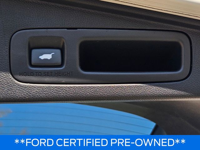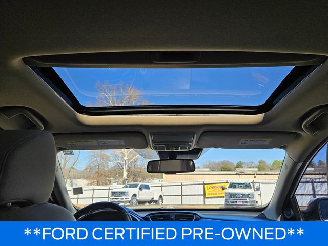 Ford Blue Advantage: Blue Certified Certified, 18" Alloy Wheels, 4-Wheel Disc Brakes, 5.64 Axle Ratio, 8 Speakers, ABS brakes, Air Conditioning, Alloy wheels, AM/FM radio: SiriusXM, Apple CarPlay/Android Auto, Auto High-beam Headlights, Auto-dimming Rear-View mirror, Automatic temperature control, Blind Spot Information (BSI) System warning, Brake assist, Bumpers: body-color, Compass, Delay-off headlights, Driver door bin, Driver vanity mirror, Dual front impact airbags, Dual front side impact airbags, Electronic Stability Control, Exterior Parking Camera Rear, Four wheel independent suspension, Front anti-roll bar, Front Bucket Seats, Front Center Armrest, Front dual zone A/C, Front fog lights, Front reading lights, Fully automatic headlights, Garage door transmitter: HomeLink, Heated door mirrors, Heated Front Bucket Seats, Heated front seats, Illuminated entry, Leather Seat Trim, Leather Shift Knob, Low tire pressure warning, Memory seat, Occupant sensing airbag, Outside temperature display, Overhead airbag, Overhead console, Panic alarm, Passenger door bin, Passenger vanity mirror, Power door mirrors, Power driver seat, Power Liftgate, Power moonroof, Power passenger seat, Power steering, Power windows, Radio data system, Radio: AM/FM/SiriusXM Audio System, Rear anti-roll bar, Rear seat center armrest, Rear window defroster, Rear window wiper, Remote keyless entry, Security system, Speed control, Speed-sensing steering, Speed-Sensitive Wipers, Split folding rear seat, Spoiler, Steering wheel mounted audio controls, Tachometer, Telescoping steering wheel, Tilt steering wheel, Traction control, Trip computer, Turn signal indicator mirrors, and Variably intermittent wipers.