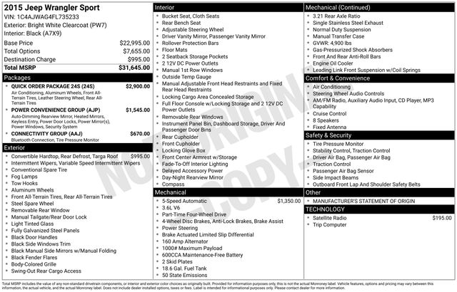 2015 Jeep Wrangler Sport 3.6L V6 24V VVT 4WD 5-Speed Automatic Bright White Clearcoat