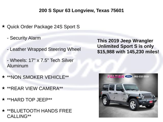 If you're in the market for a capable and well-equipped Jeep Wrangler, this 2019 Unlimited Sport S is an exceptional choice. With its impressive features, powerful performance, and stylish design, it's sure to exceed your expectations.
