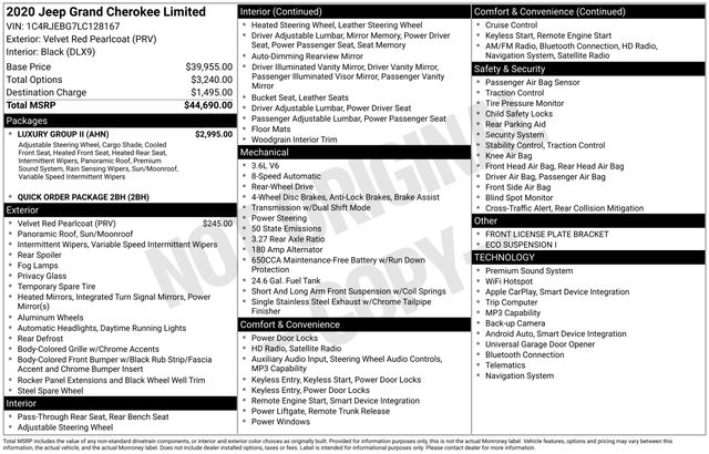2020 Jeep Grand Cherokee Limited 3.6L V6 24V VVT RWD 8-Speed Automatic Velvet Red Pearlcoat