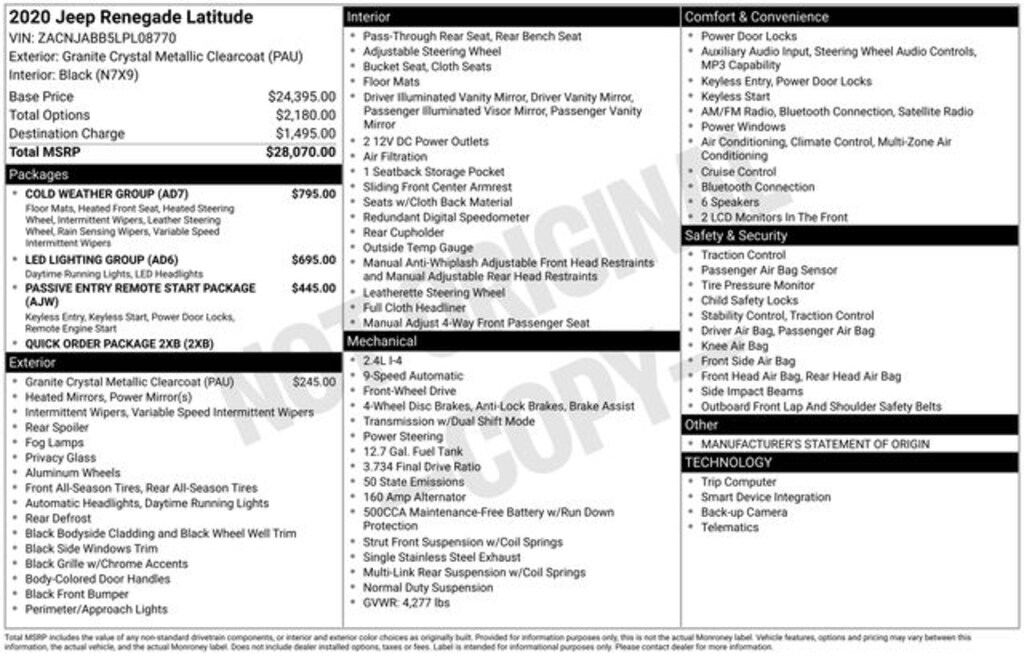 2020 Jeep Renegade Latitude 2.4L I4 FWD 9-Speed 948TE Automatic Granite Crystal Metallic Clearcoat