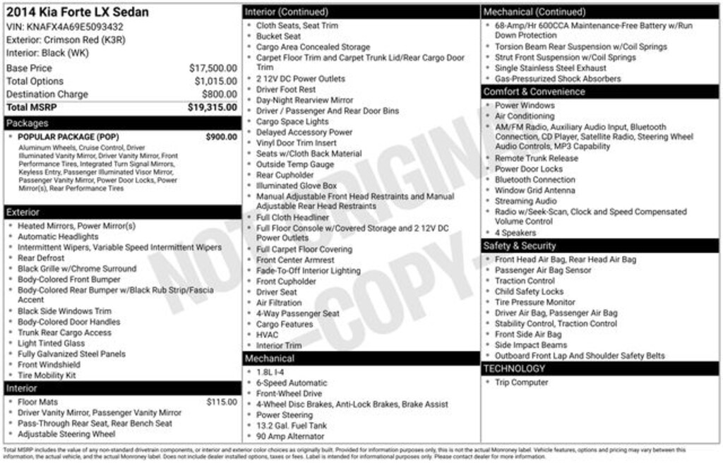 2014 Kia Forte LX 1.8L I4 DOHC Dual CVVT FWD 6-Speed Automatic Crimson Red