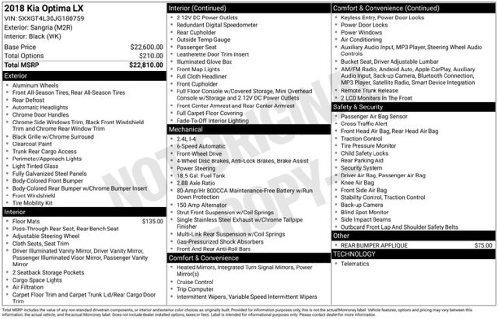 2018 Kia Optima LX 2.4L I4 DGI DOHC FWD 6-Speed Automatic with Sportmatic Sangria