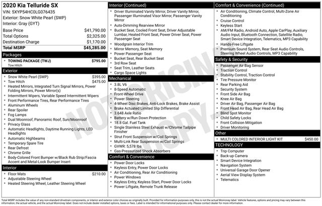 2020 Kia Telluride SX 3.8L V6 DGI DOHC Dual CVVT FWD 8-Speed Automatic Snow White Pearl