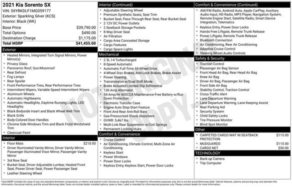 2021 Kia Sorento SX 2.5L I4 DGI Turbocharged DOHC 16V LEV3-ULEV70 281hp AWD 8-Speed DCT Sparkling Silver