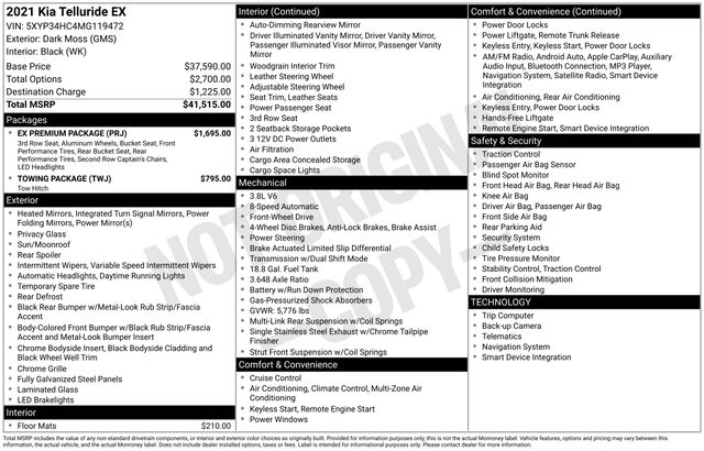 2021 Kia Telluride EX 3.8L V6 DGI DOHC Dual CVVT FWD 8-Speed Automatic Dark Moss