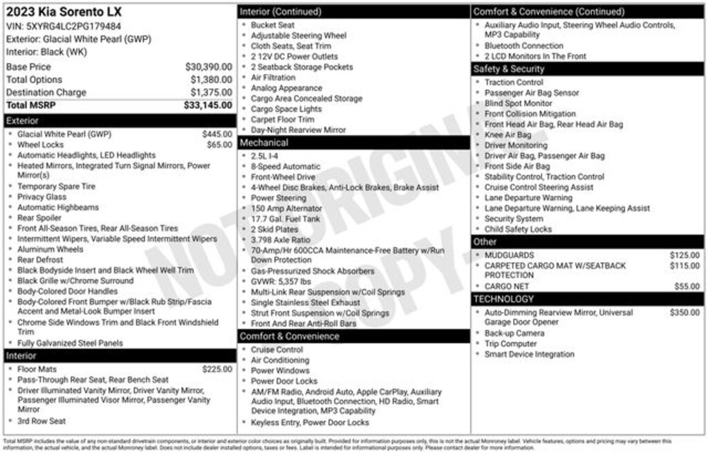 2023 Kia Sorento LX 2.5L I4 DGI DOHC 16V LEV3-ULEV70 191hp FWD 8-Speed Automatic Glacial White Pearl