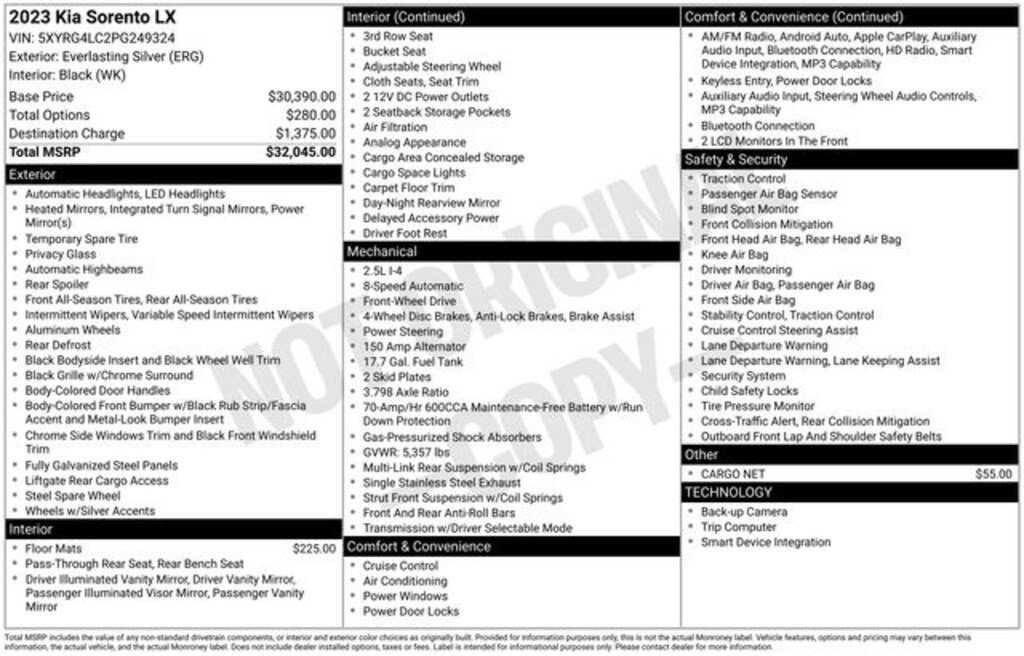 2023 Kia Sorento LX 2.5L I4 DGI DOHC 16V LEV3-ULEV70 191hp FWD 8-Speed Automatic Everlasting Silver
