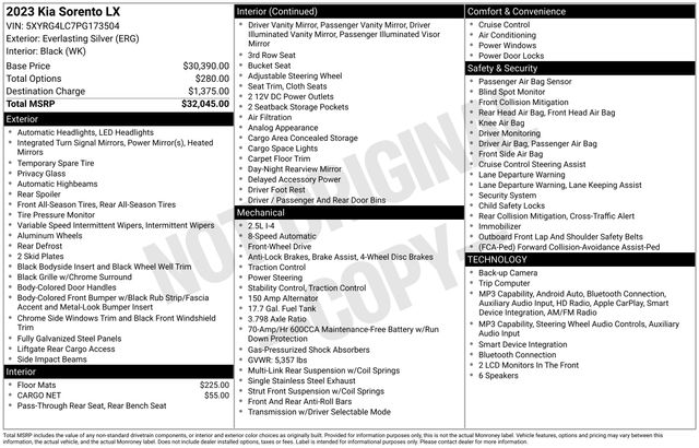 2023 Kia Sorento LX 2.5L I4 DGI DOHC 16V LEV3-ULEV70 191hp FWD 8-Speed Automatic Everlasting Silver 24/29 City/Highway MPG
