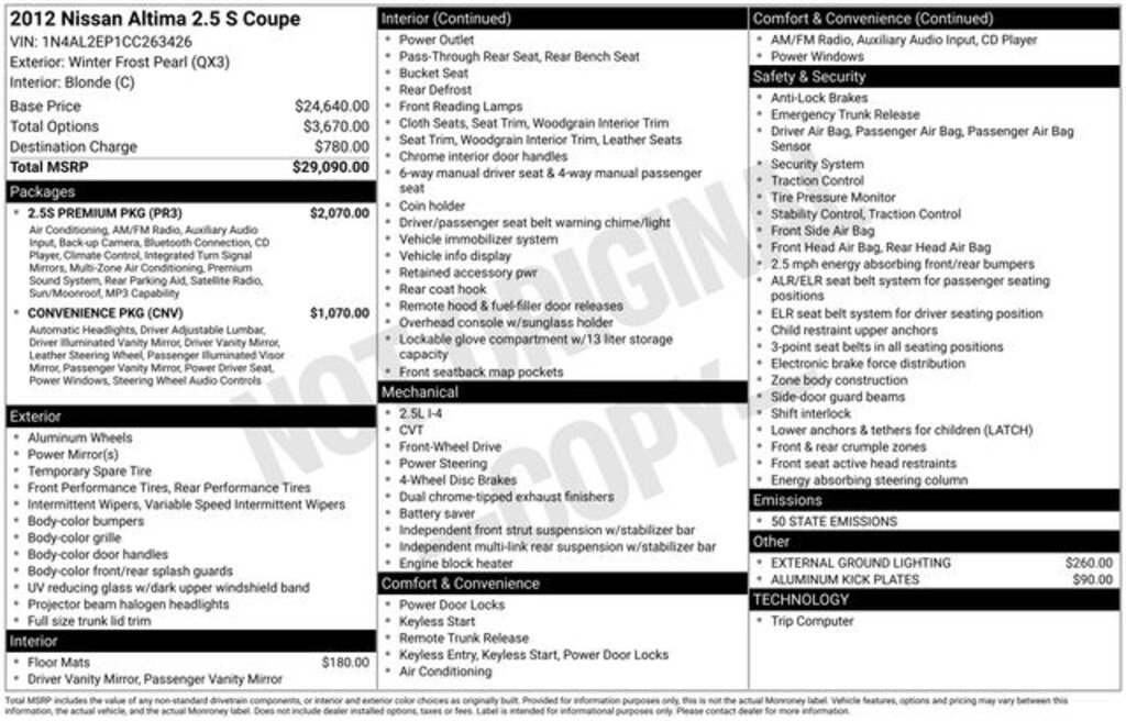 2012 Nissan Altima 2.5 S 2.5L I4 SMPI DOHC FWD CVT with Xtronic Winter Frost Pearl