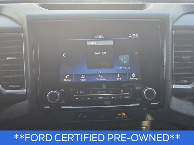 SV Convenience Package (120V Power Outlet in Bed, 120V Power Outlet in Rear Center Console, Bed Under-Rail Lighting, Front Halogen Fog Lights, Heated Front Seats, Heated Leather Steering Wheel, Heated Outside Mirrors, HVAC - Dual-Zone Front Auto A/C, I-Key w/Request Switches on O/S Handles, Illuminated Locking Glove Box, Leather Shift Lever, Overhead Console Storage (Sunglass Holder), Remote Engine Starter, Sliding Rear Window, Spray-In Bedliner, Tow/Haul Mode Switch, Trailer Hitch w/Wiring Harness, and Utili-Track System), Technology Package (Blind Spot Warning, High Beam Assist (HBA), Intelligent Cruise Control, Lane Departure Warning System, Rear Automatic Braking (RAB), Rear Cross Traffic Alert (RCTA), and Rear Sonar System), Tow Package: Hitch, Tow Harness, Ford Blue Advantage: Blue Certified Certified, 17" Alloy Wheels, 3.692 Axle Ratio, 4-Wheel Disc Brakes, 6 Speakers, ABS brakes, Air Conditioning, Alloy wheels, AM/FM radio: SiriusXM, Anti-whiplash front head restraints, Apple CarPlay/Android Auto, Brake assist, Bumpers: body-color, Carpeted Floor Mats, Delay-off headlights, Driver door bin, Driver vanity mirror, Dual front impact airbags, Dual front side impact airbags, Electronic Stability Control, Electronic Tailgate Lock, Front anti-roll bar, Front Bucket Seats, Front Center Armrest, Front reading lights, Front wheel independent suspension, Fully automatic headlights, Illuminated entry, Knee airbag, Low tire pressure warning, Occupant sensing airbag, Overhead airbag, Panic alarm, Passenger door bin, Passenger vanity mirror, Power door mirrors, Power driver seat, Power steering, Power windows, Premium Cloth Seat Trim, Radio data system, Radio: SXM/AM/FM/AUX/USB Audio System w/6 Speakers, Rear anti-roll bar, Rear seat center armrest, Rear step bumper, Remote keyless entry, Security system, Speed control, Speed-sensing steering, Splash Guards, Split folding rear seat, Steering wheel mounted audio controls, Tachometer, Tilt steering wheel, Traction control, Trip computer, Variably intermittent wipers, and Voltmeter.