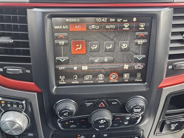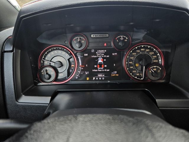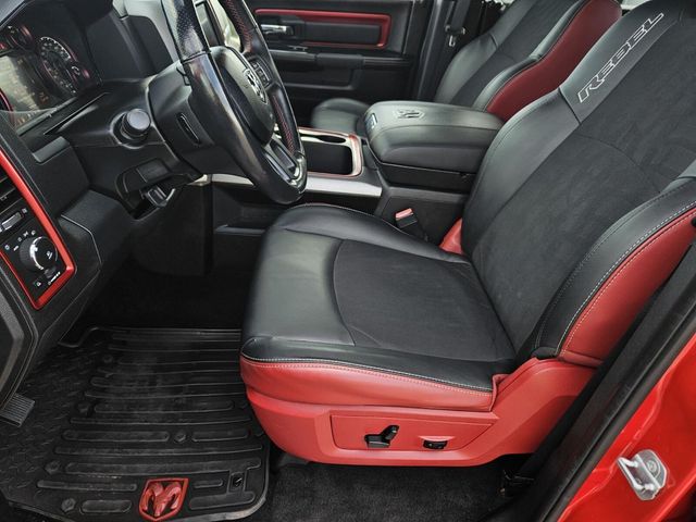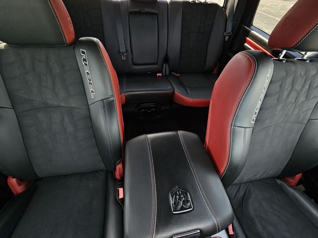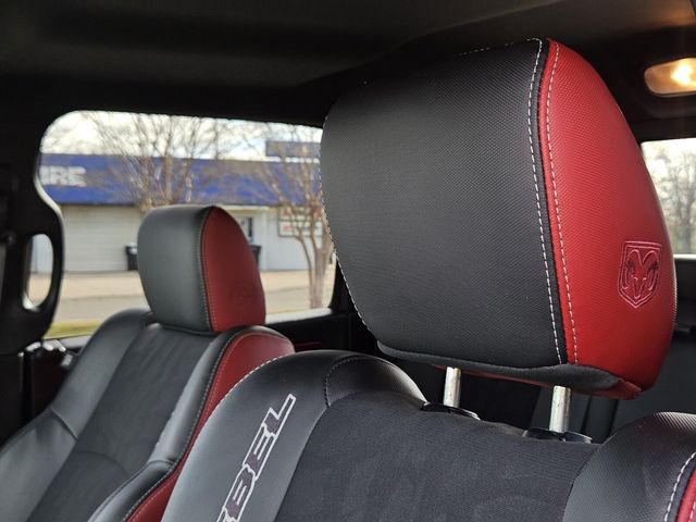 MOPAR 10 Package (DISC), Protection Group, Quick Order Package 26W Rebel (Dual Rear Exhaust w/Bright Tips, Flat Black 5.7L Hemi Badge, Flat Black Ram 1500 Badge, and Ram Glove Box Badge), 3.92 Rear Axle Ratio, 32 Gallon Fuel Tank, 4-Wheel Disc Brakes, 6 Month Trial (Reg. Required), 6 Month Trial (Registration Required), 6 Speakers, 8.4" Touchscreen Display, ABS brakes, Air Conditioning, Air Conditioning ATC w/Dual Zone Control, Alloy wheels, AM/FM radio, Anti-Spin Differential Rear Axle, Auto-leveling suspension, Black Tubular Side Steps, Brake assist, Compass, Delay-off headlights, Driver door bin, Dual front impact airbags, Dual front side impact airbags, Electronic Shift, Electronic Stability Control, For Details Visit DriveUconnect.com, Front anti-roll bar, Front Bucket Seats, Front Center Armrest w/Storage, Front fog lights, Front reading lights, Front wheel independent suspension, Fully automatic headlights, GPS Antenna Input, Heated door mirrors, Heated front seats, Heated steering wheel, Illuminated entry, Integrated Voice Command w/Bluetooth, Leather steering wheel, Low tire pressure warning, Media Hub (SD, USB, AUX), MOPAR Sport Performance Hood Decal (DISC), Nav-Capable! See Dealer for Details, Occupant sensing airbag, Outside temperature display, Overhead airbag, Overhead console, Panic alarm, ParkView Rear Back-Up Camera, Passenger door bin, Passenger vanity mirror, Power door mirrors, Power driver seat, Power passenger seat, Power steering, Power windows, Premium Cloth Seats w/Emboss Tread Pattern, Radio data system, Radio: Uconnect 5.0, Radio: Uconnect 8.4, Rear anti-roll bar, Rear seat center armrest, Rear step bumper, Rear View Auto Dim Mirror w/Display, Rebel Instrument Cluster, Remote keyless entry, Remote SD Card Slot, SIRIUSXM Satellite Radio, Speed control, Split folding rear seat, Spray In Bedliner, Steering wheel mounted audio controls, Tachometer, Tilt steering wheel, Tip Start, Tonneau Cover w/Embossed Ram's Head, Traction control, Trip computer, Uconnect Access, Variably intermittent wipers, Voltmeter, and Wheels: 17" x 8" Aluminum w/Matte Black PockeT.