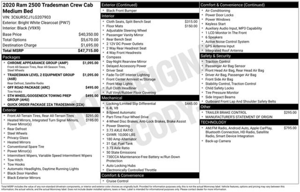 2020 Ram 2500 Tradesman 6.4L Heavy Duty V8 HEMI w/MDS 4WD 8-Speed Automatic Bright White Clearcoat