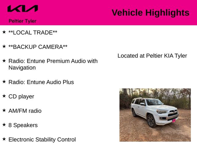 Recent Arrival! **LOCAL TRADE**, **BACKUP CAMERA**, 8 Speakers, AM/FM radio, Brake assist, Bumpers: body-color, CD player, Driver door bin, Driver vanity mirror, Electronic Stability Control, Exterior Parking Camera Rear, Front fog lights, Front reading lights, Garage door transmitter: HomeLink, Heated door mirrors, Illuminated entry, Leather Shift Knob, Leather steering wheel, Outside temperature display, Overhead console, Panic alarm, Passenger vanity mirror, Power door mirrors, Radio: Entune Audio Plus, Radio: Entune Premium Audio with Navigation, Rear seat center armrest, Roof rack: rails only, Speed control, Tachometer, Telescoping steering wheel, Tilt steering wheel, Trip computer, Voltmeter.