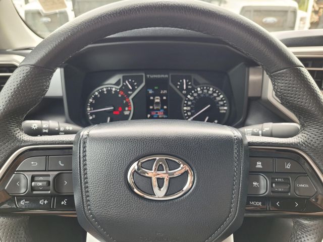 The TRD Sport Package elevates this Tundra's performance and style, with features like a sport-tuned and lowered suspension, Bilstein shocks, and 20-inch alloy wheels. Inside, the leather-wrapped steering wheel adds a premium touch to the well-appointed cabin.