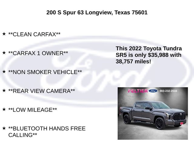 This Tundra's combination of power, efficiency, and premium features make it an exceptional value in the full-size truck segment. Whether you're hauling heavy loads or enjoying a weekend adventure, this 2022 Toyota Tundra SR5 is ready to exceed your expectations.